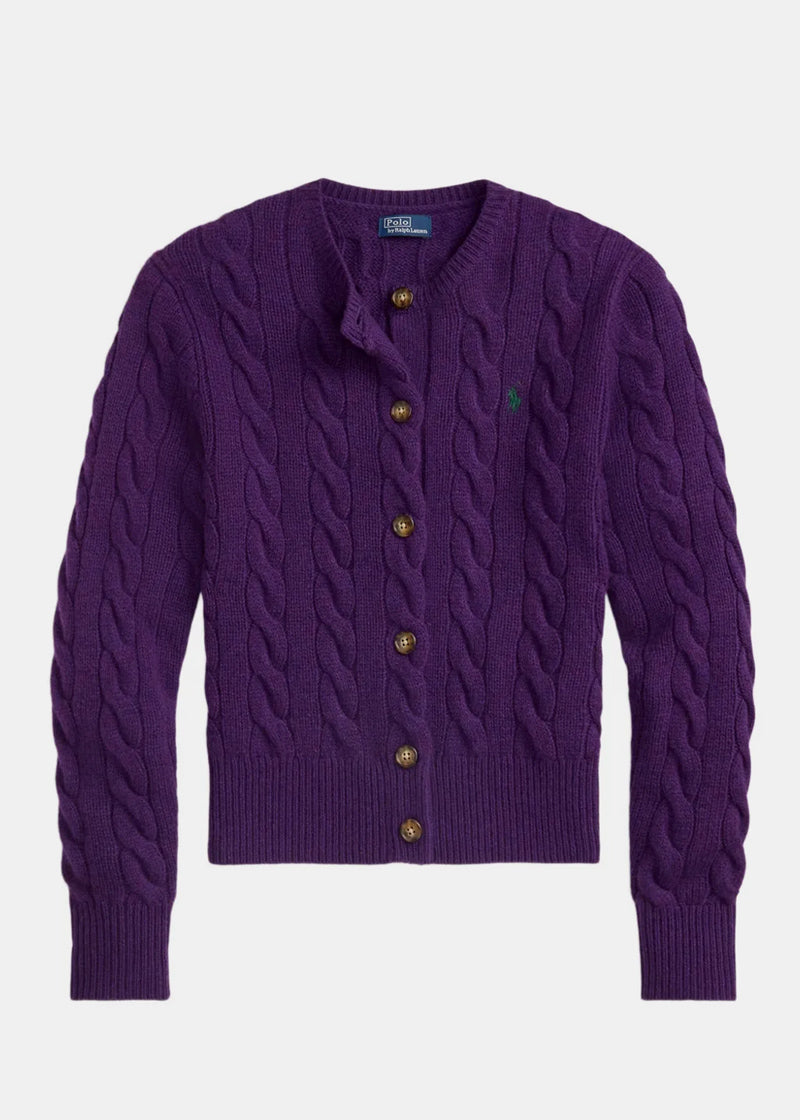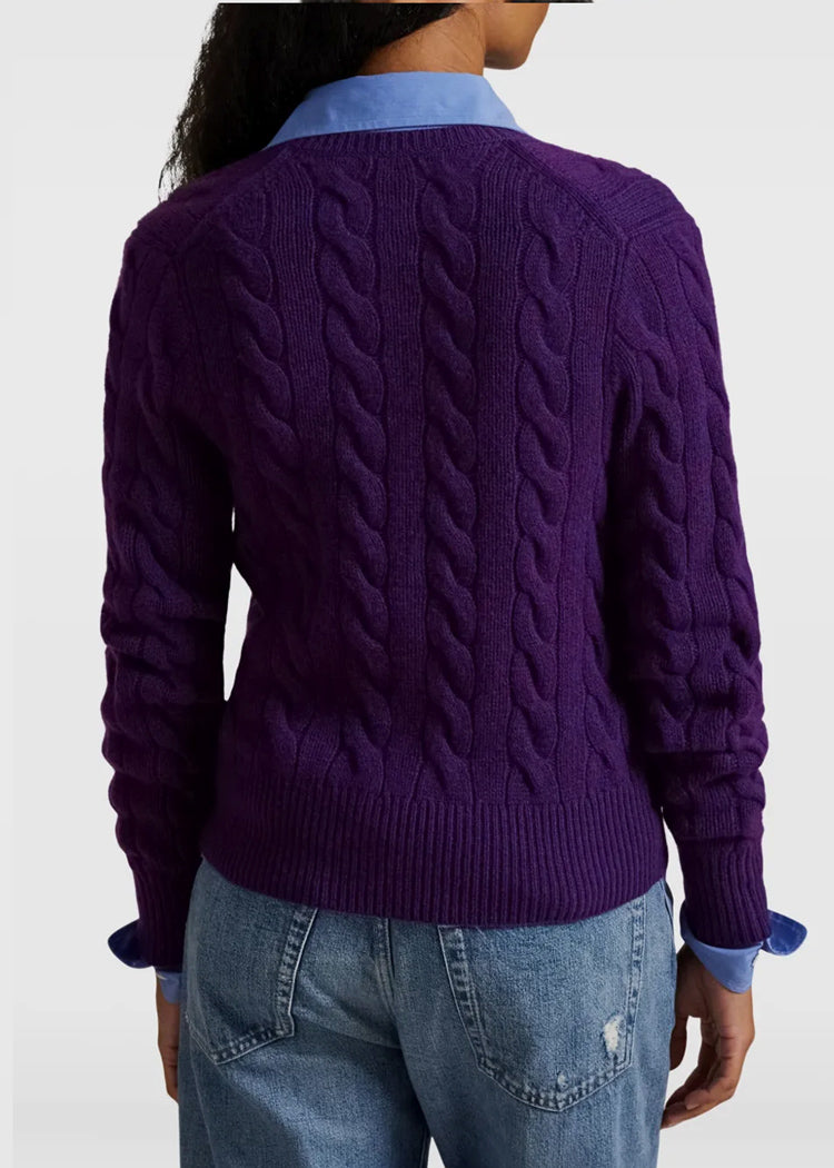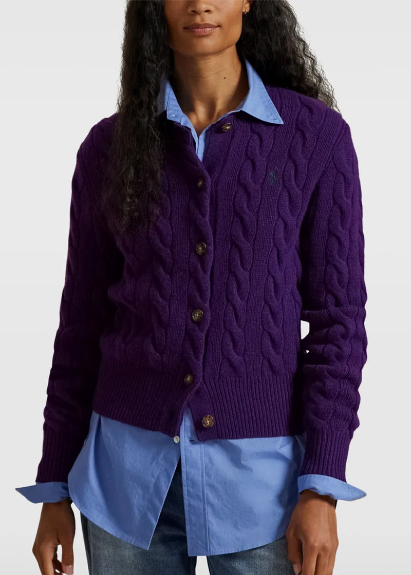 Cable-knit cardigan in royal purple.