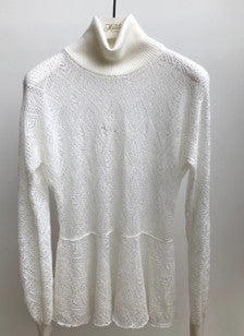 Top in 'ice white' wool open-work knit. Turtleneck collar. Light ruffles at hem. Solid rib knit turtleneck and cuffs.