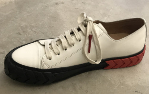 Low-top in white leather. Lace-up front with tongue. Graphic black foxing with red rubber heel. Rubberized lace tips.