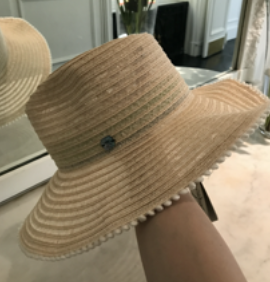 Wide brim hat in natural blended hemp straw. Shaped crown. Foldable brim with inset wire for adaptable styling. Fringed brim in white.