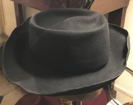 Hat in black rabbit fur felt. Telescopic crown and curled wide brim. Elastic ribbing sweatband.