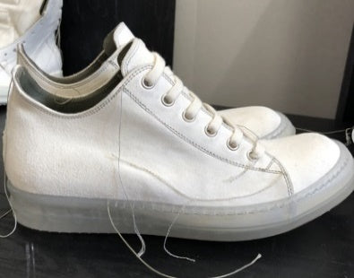 Low top 'Ramone' sneakers in sueded 'milk' white leather with subtle patterned finish. Flat laces in white. Transparent synthetic outsole.