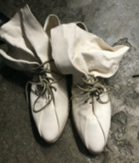 Shoes in white grain leather. Wrapped front with high tongue and laces. Low heel.