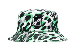 Cotton twill bucket hat in white featuring green, grey and black graphic pattern print throughout. Black and white rubberized logo patch at face. Black and white textile logo patch at side. Lined. Approx. 5.5cm brim length.