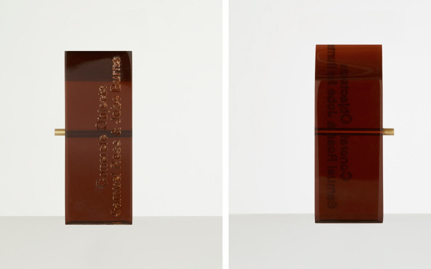 Epoxy resin is cast with a prominent right angle in the making of the Compression Burner. The material has been formulated for light to seep through, imbuing this piece with perpetuity. The placement of the brass piping brings balance, where the asymmetrical usage of a right angle disrupts it. Signature CONCRETE OBJECTS text is engraved in inaudible lettering on the underside of the burner.