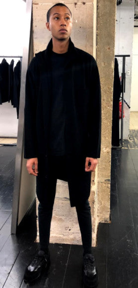 Scarf in black and red/grey houndstooth wool. Panels connected by needle punch.