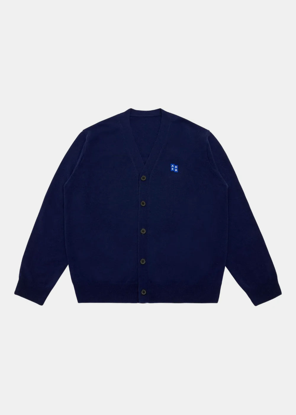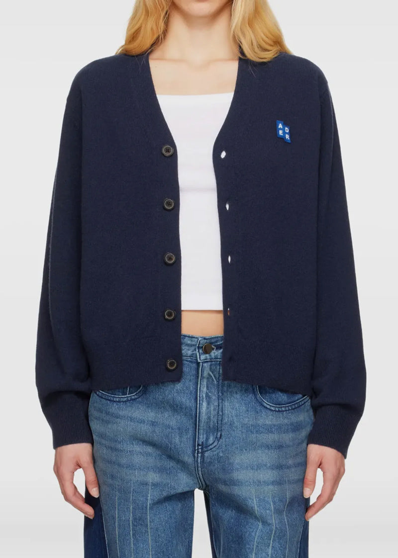 Button-fastening logo-detail cardigan in blue.