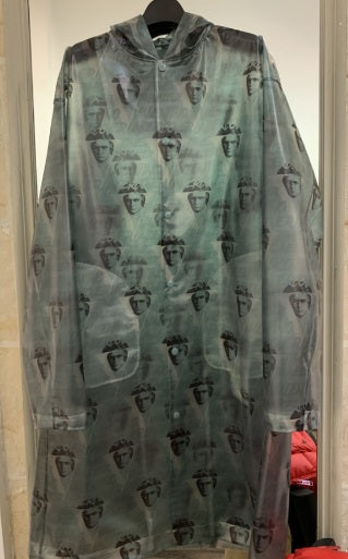 Hooded transparent long coat in green featuring graphic print throughout. Slash pockets at waist. Snap button closure at front.