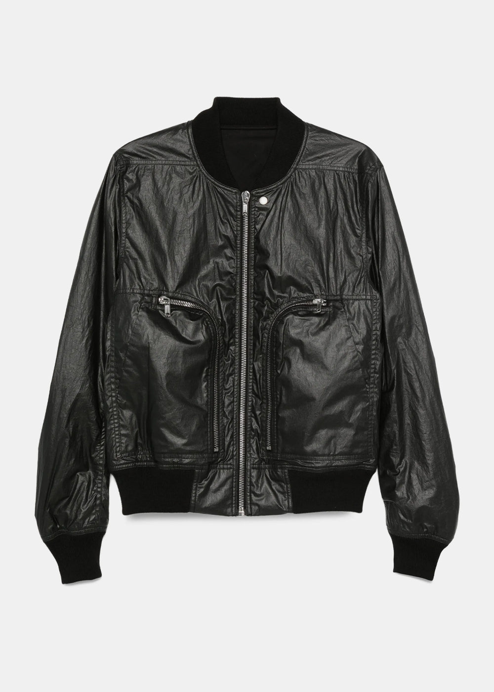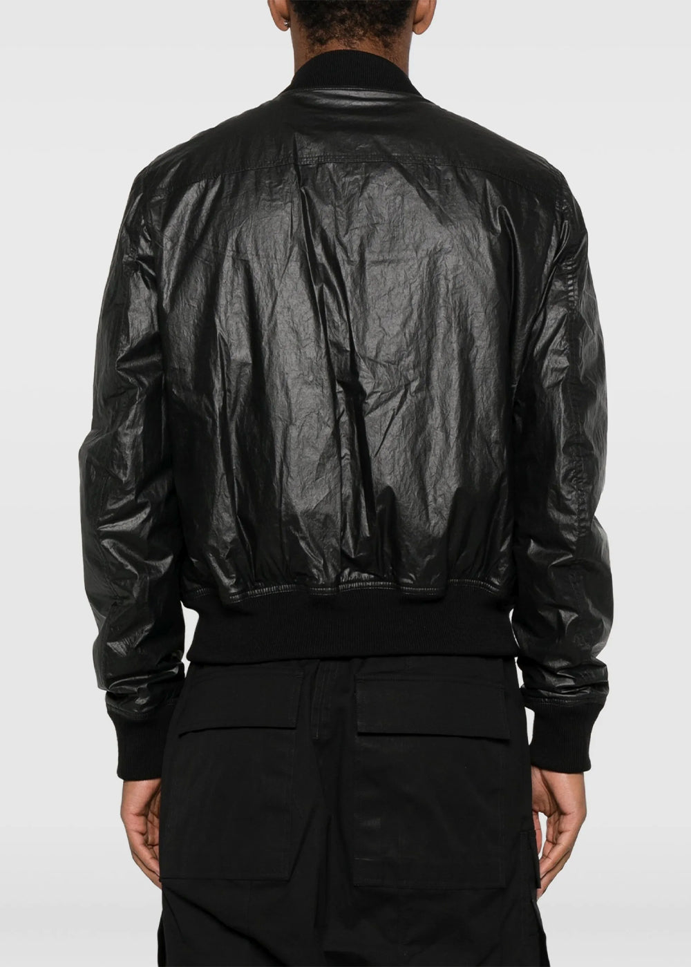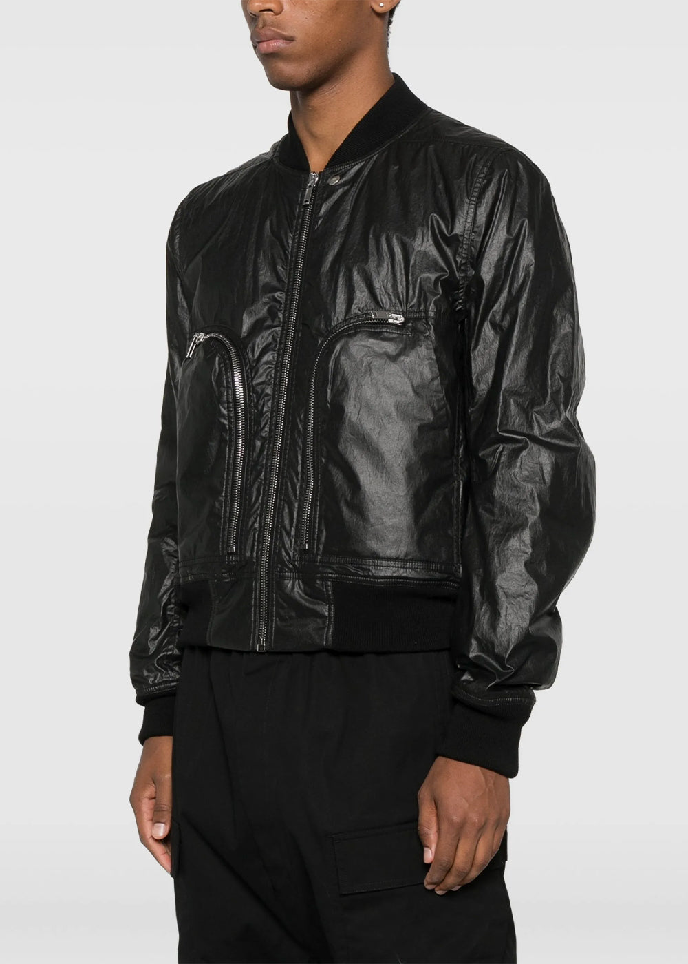 Coated cotton zip-fastening bomber jacket in black.