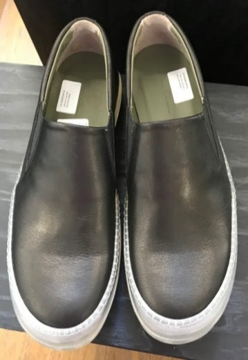 Low top slip on sneakers in black smooth leather. Elastic gussets at foot opening for ease of fit. Transparent synthetic outsole.