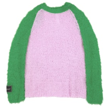 Long-sleeved fluffy knit top in pink featuring green crewneck collar and sleeves. Rib-knit crewneck collar, cuffs, and hem. Black suede fabric beads embroidery patch at back hem.