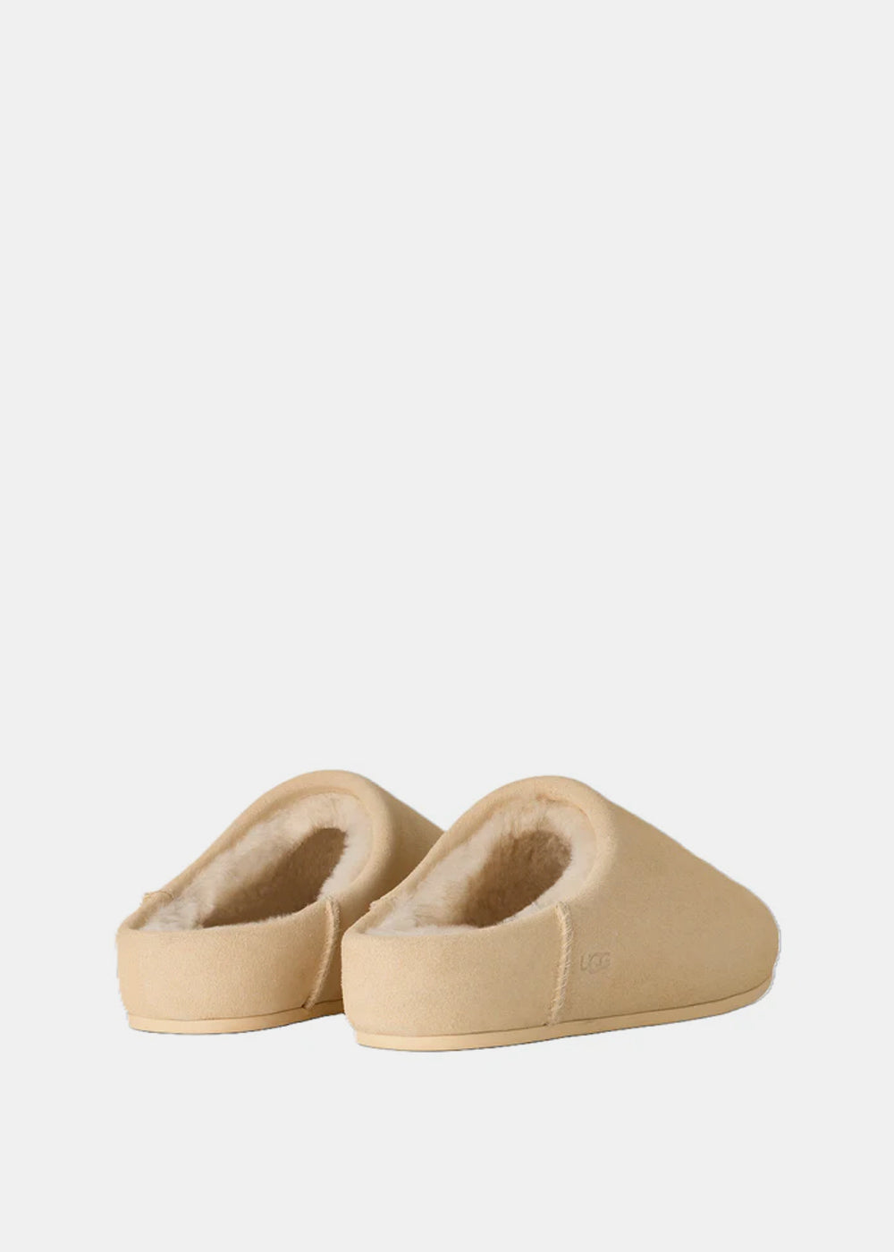 Sheepskin-lining flat-sole mules in pale buttercup.