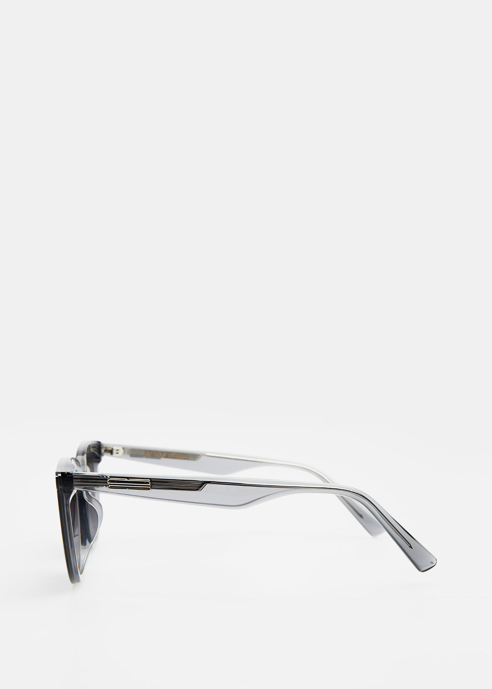 Heizer tinted sunglasses from GENTLE MONSTER featuring grey tinted lenses, round frame, embossed logo to the side, straight arms, curved tips and UV-protective lenses. These glasses come with a protective case.