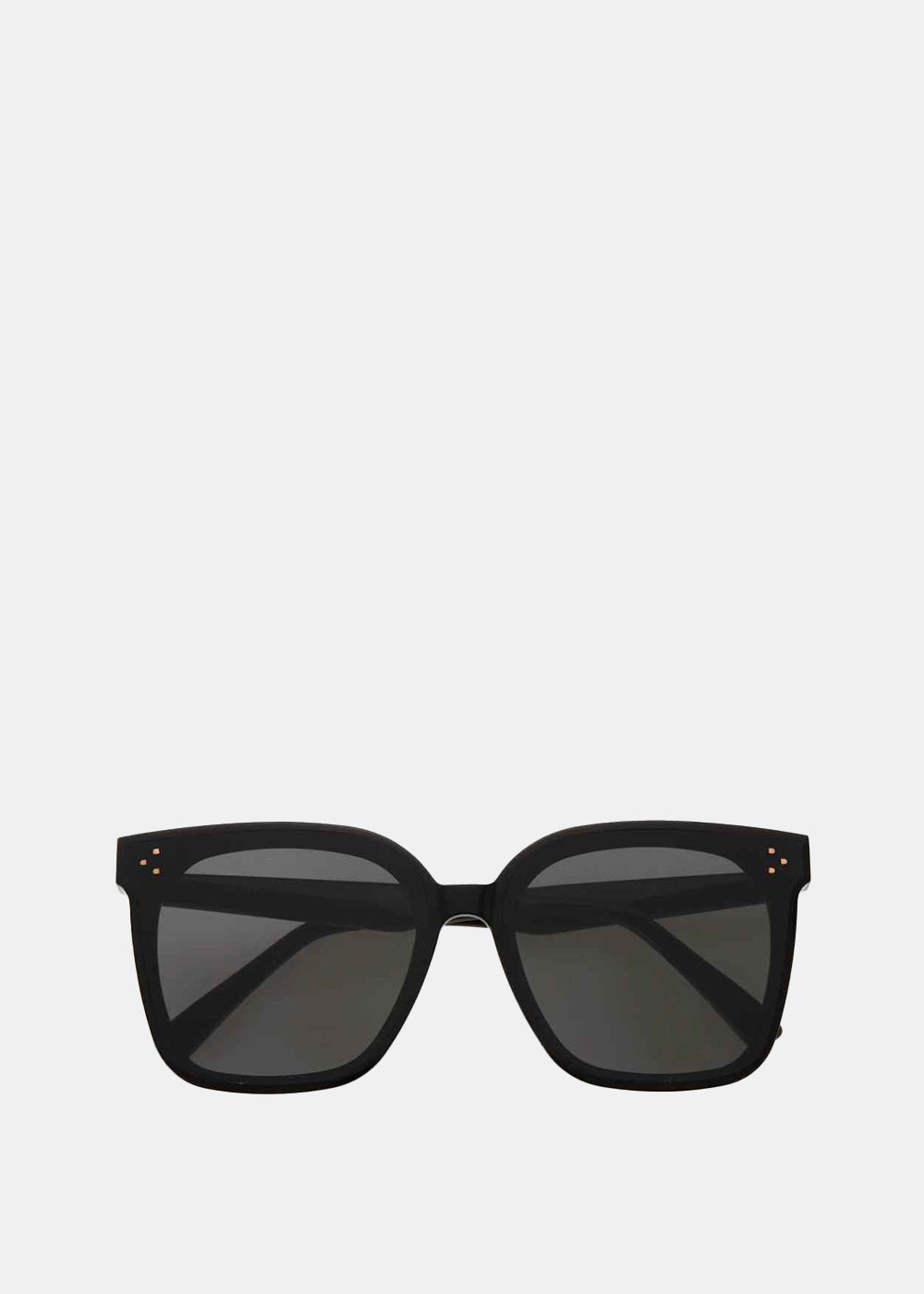 Oversized square sunglasses from the 2020 New Flatba Series. Black frame and tinted lenses. Three bullet shaped pins at front. Logo at temples. 99.9% UV protected nylon Zeiss lenses. Comes with a protective case.