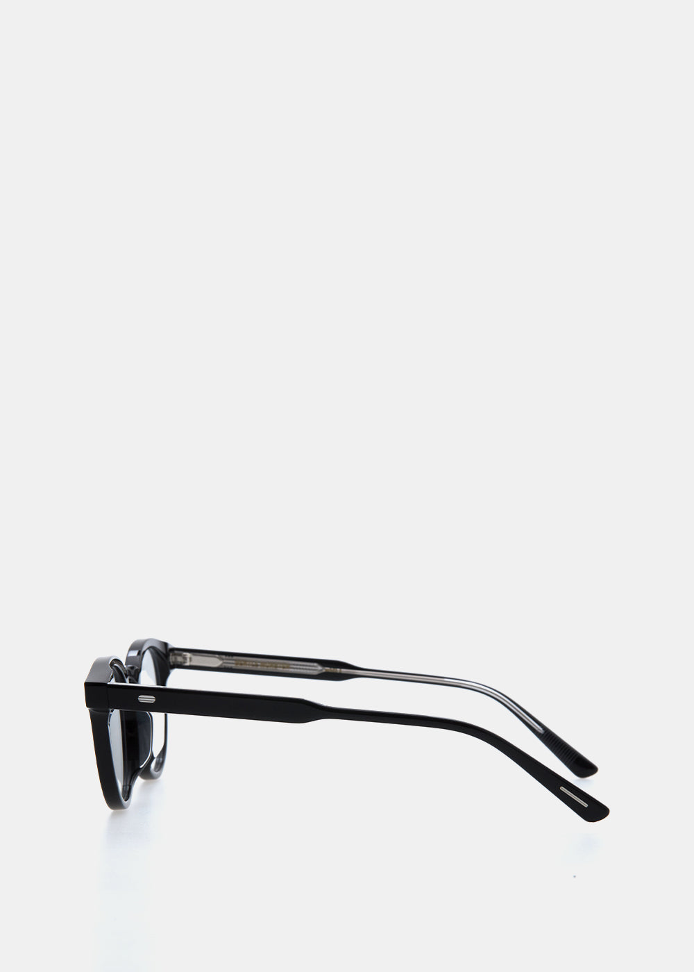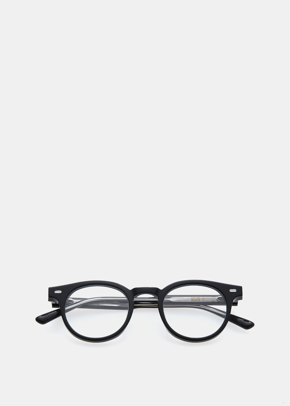 Boston-style round acetate frame in black. Keyhole bridge. Blue light filtering clear Zeiss lenses with 99.9% UV protection.