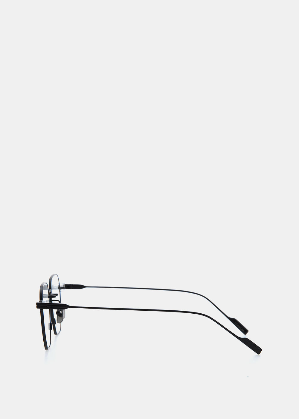 Black/clear titanium Tap Tap C1 square-frame glasses from GENTLE MONSTER featuring clear lenses, UV-protective lenses, blue-light filtering lenses, square frame, straight arms, curved tips and nose pads. These glasses come with a protective case.
