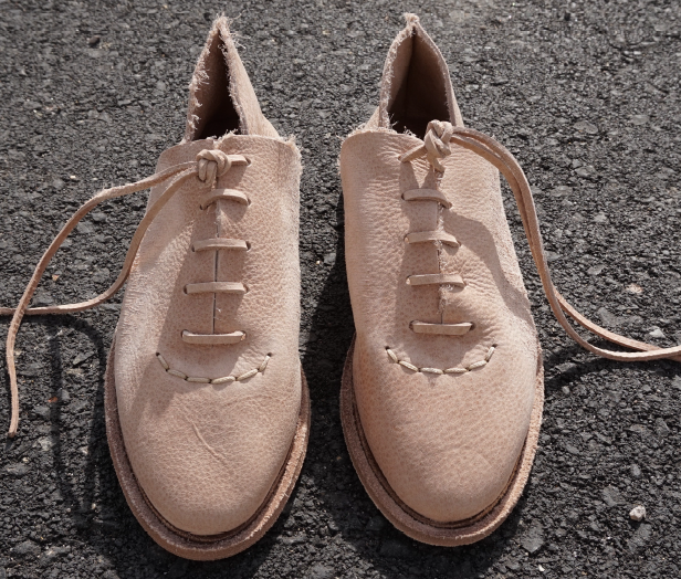 Low cut almond toe shoes in beige leather. Tonal leather lace up. Embroidered details at vamp. Two parts panel constructed heel counter. Raw edges throughout. Stacked leather outsole.