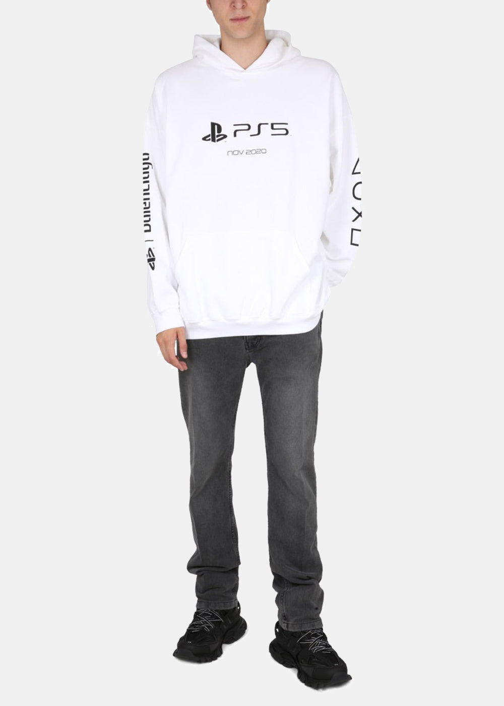 Straight-leg stretch cotton jeans in wash black. Five-pocket styling. Button fly. Belt loops. Black logo patch at back waist. Tonal stitching. Silver-tone hardware.
