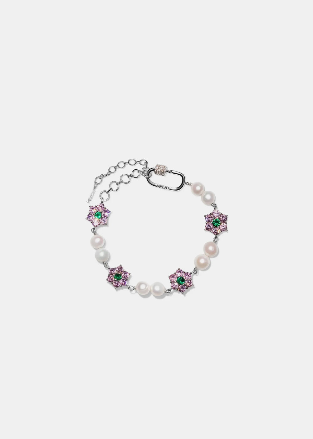 18k white gold macro pink & green flower stone freshwater pearl bracelet silver-tone.