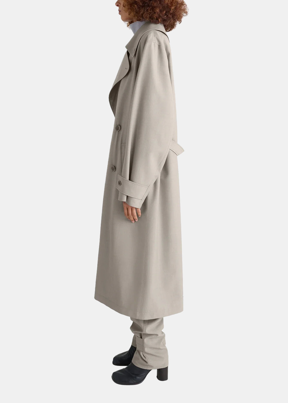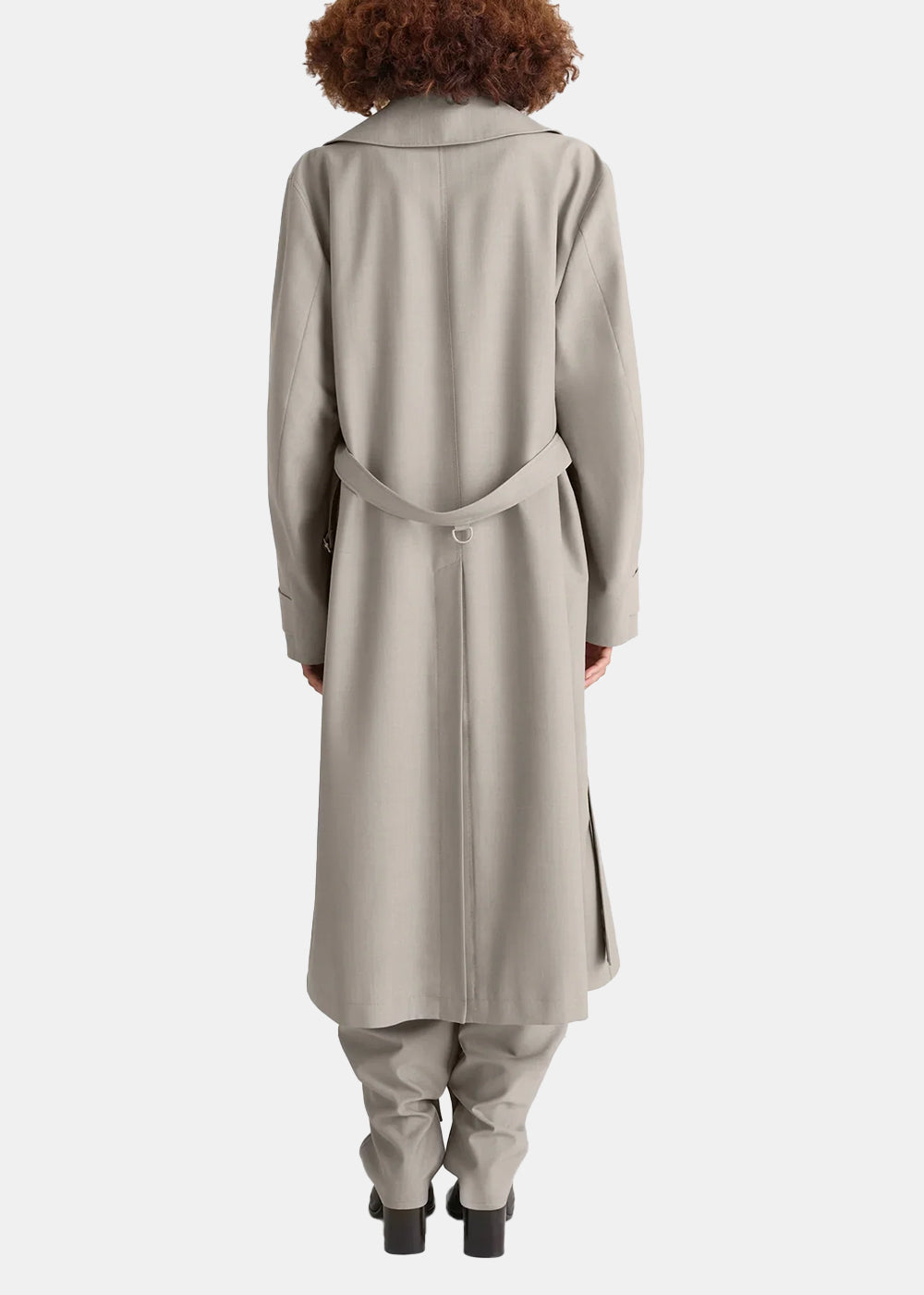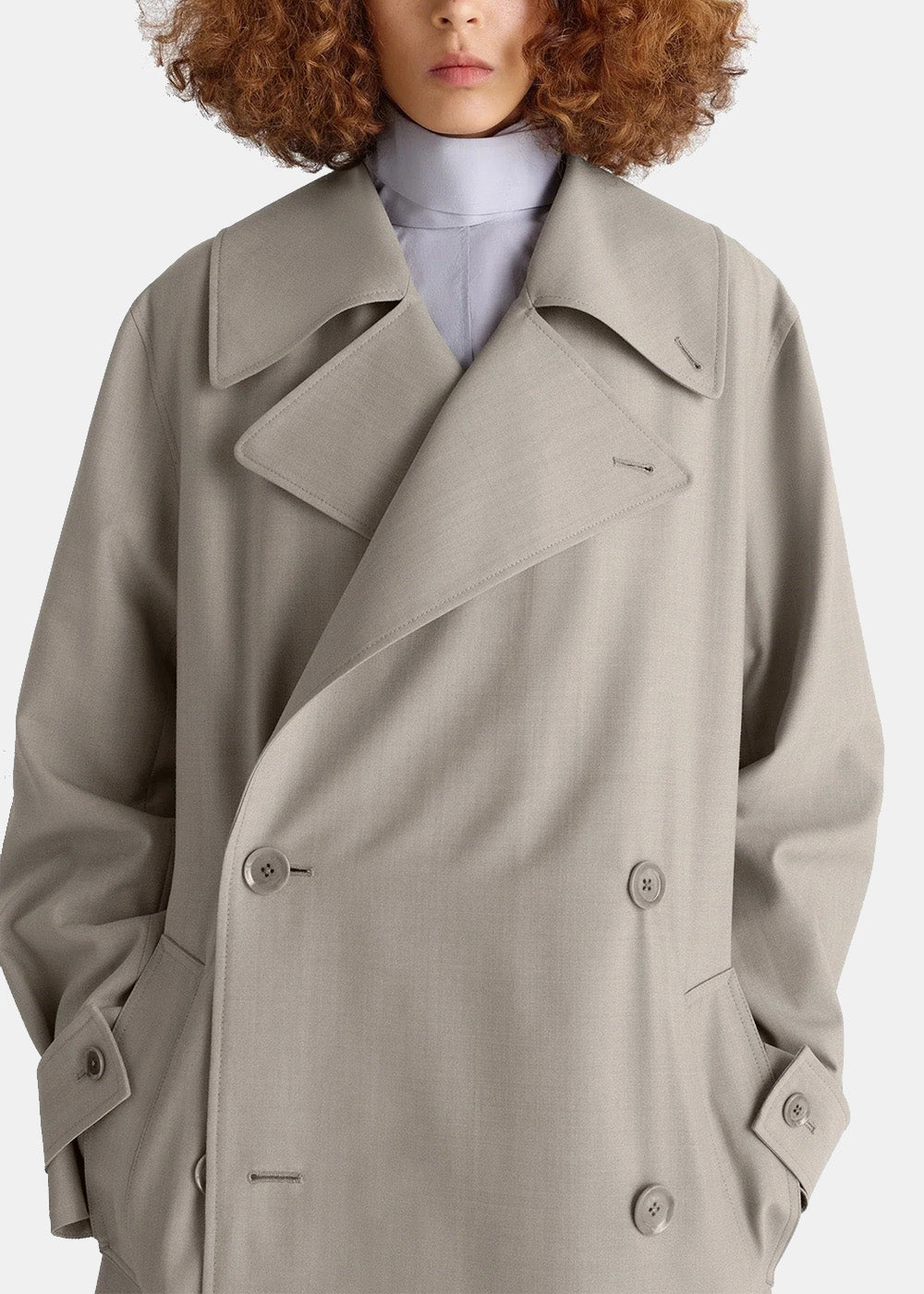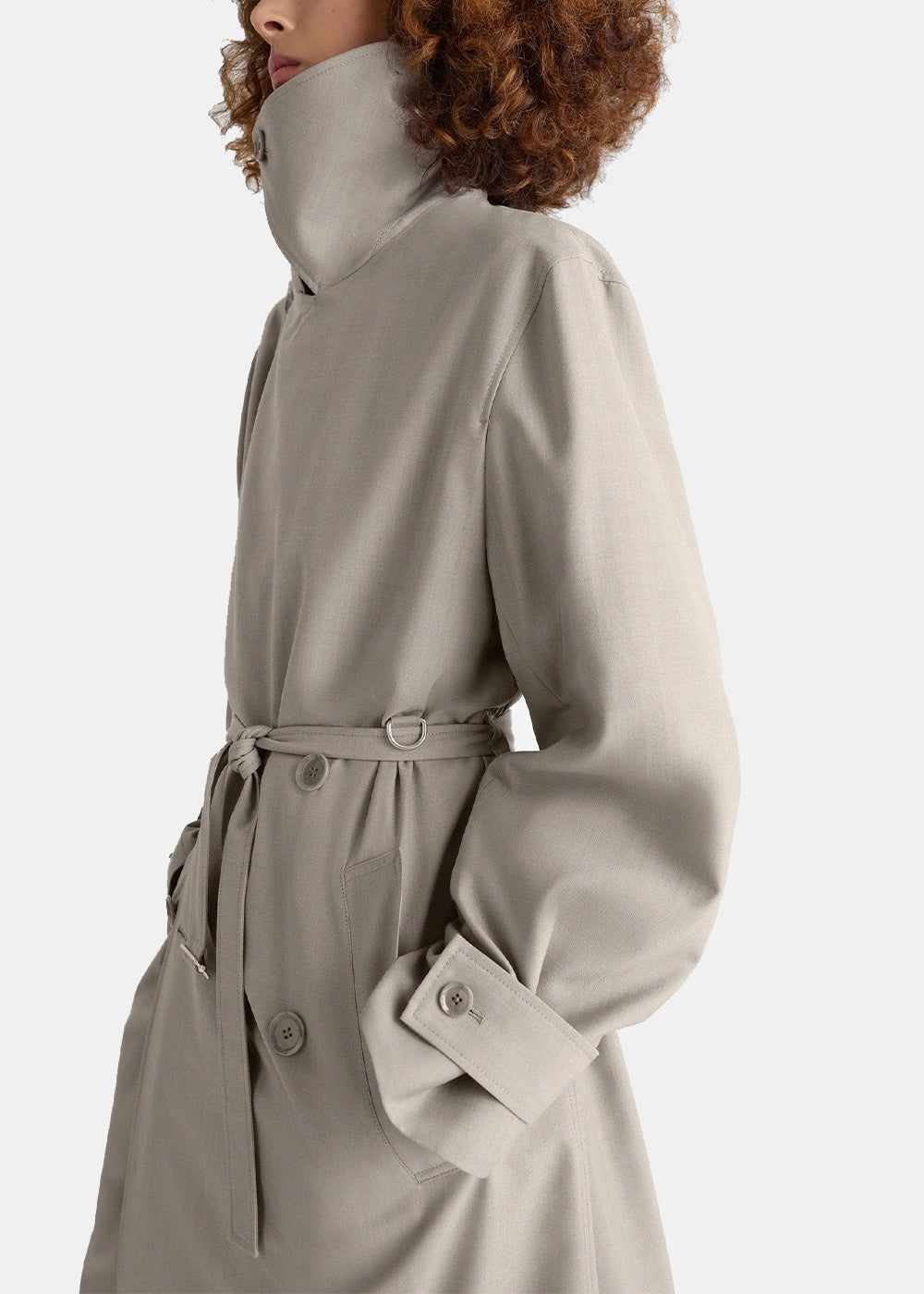 Fabric double-breasted belted trench coat in light taupe.