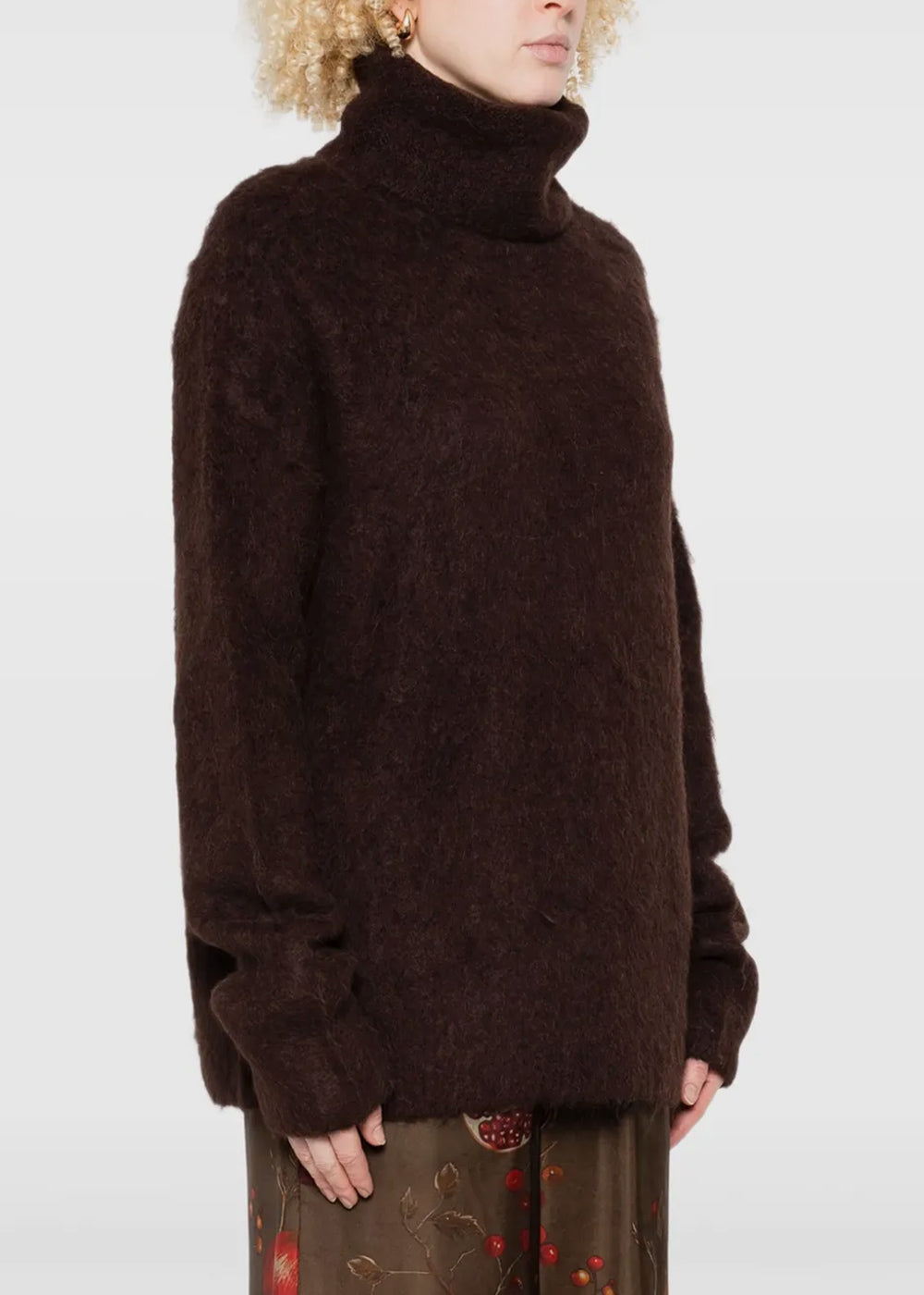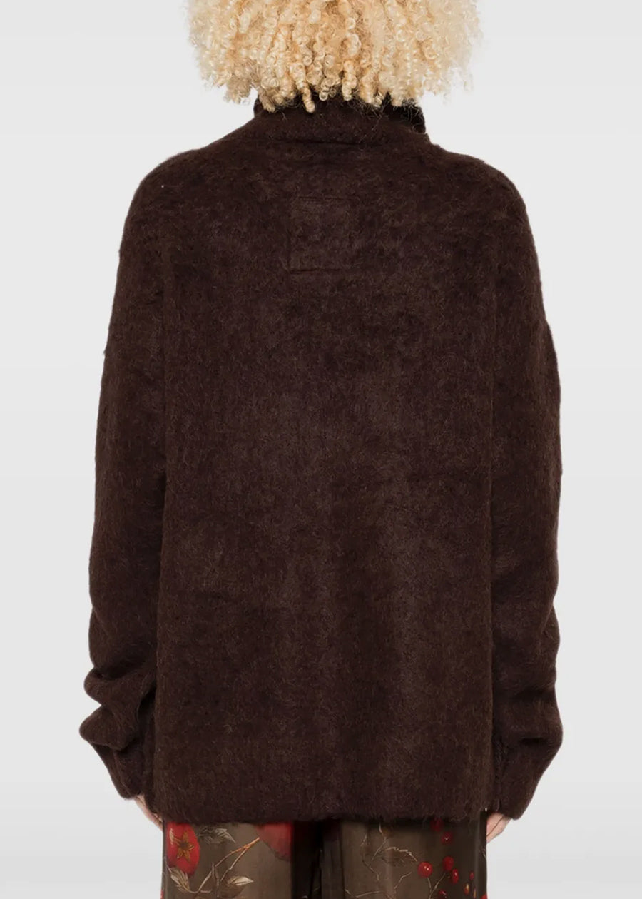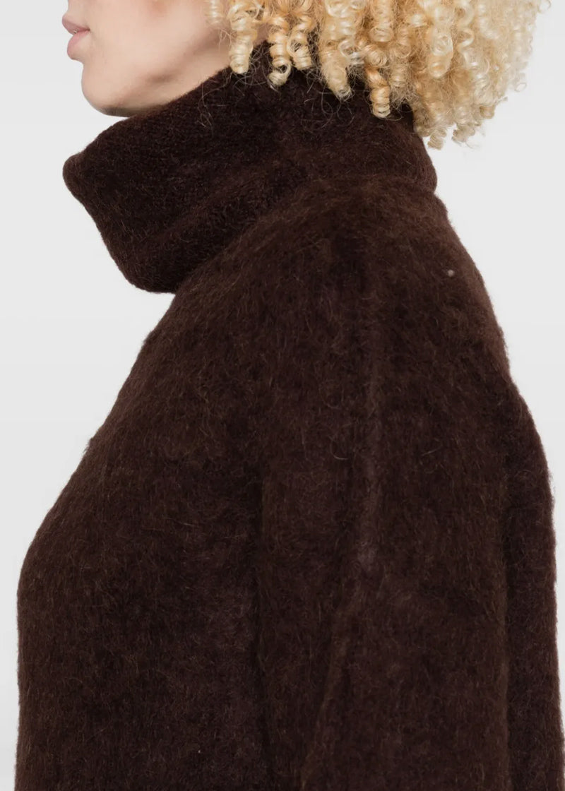 Turtleneck fluffy sweater in dark brown.