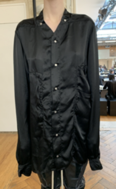 Long-sleeved shirt in black. Convertible collar with snap buckle closure at front. Oversized fit. Double patch pockets at chest. Snap button fastening at cuffs.