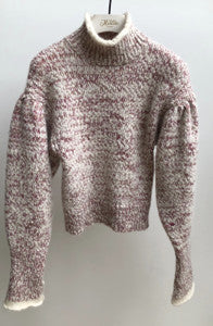 Cropped turtleneck in pink melange. White built-up collar. Long sleeves with dropped and gathered shoulders. Cropped slim fit. Fuzzy texture.