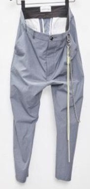 Pants in sky blue cotton. Button closure and button fly. Slash side pockets and welt rear pockets. Dropped crotch and tapered legs. Raw edge cuffs.