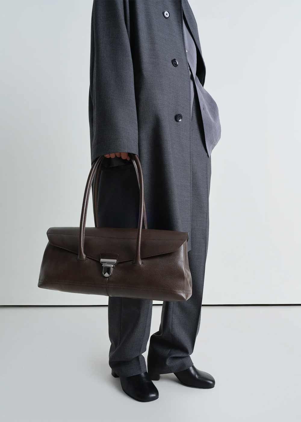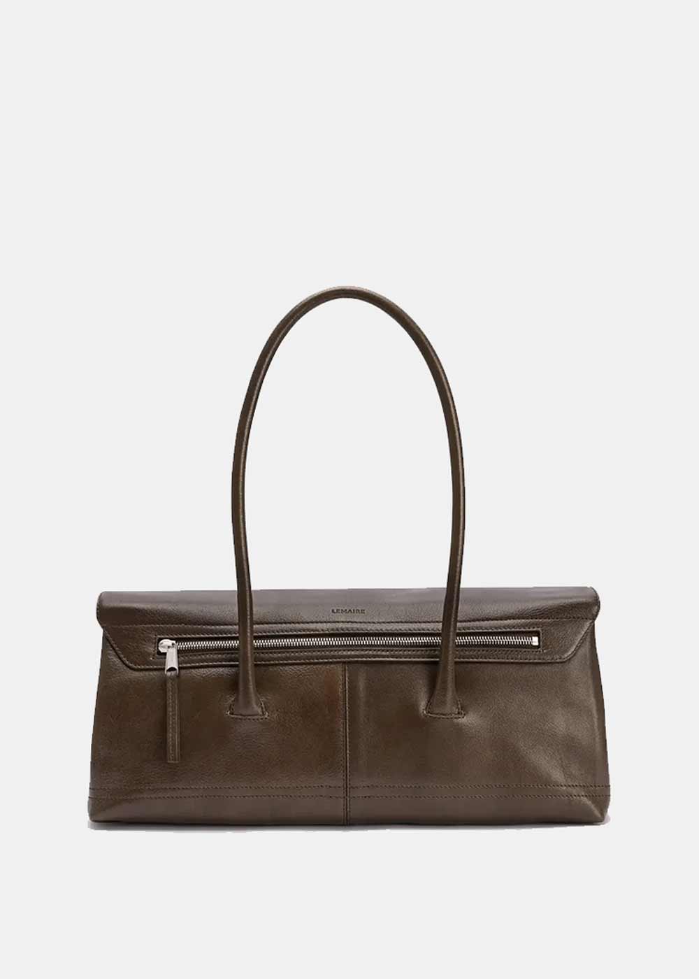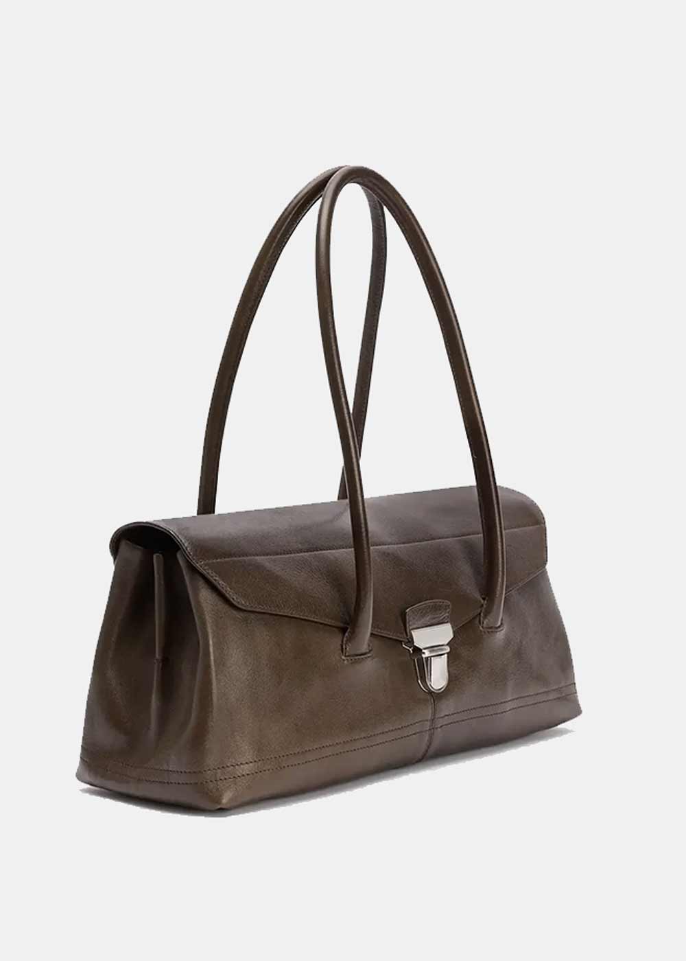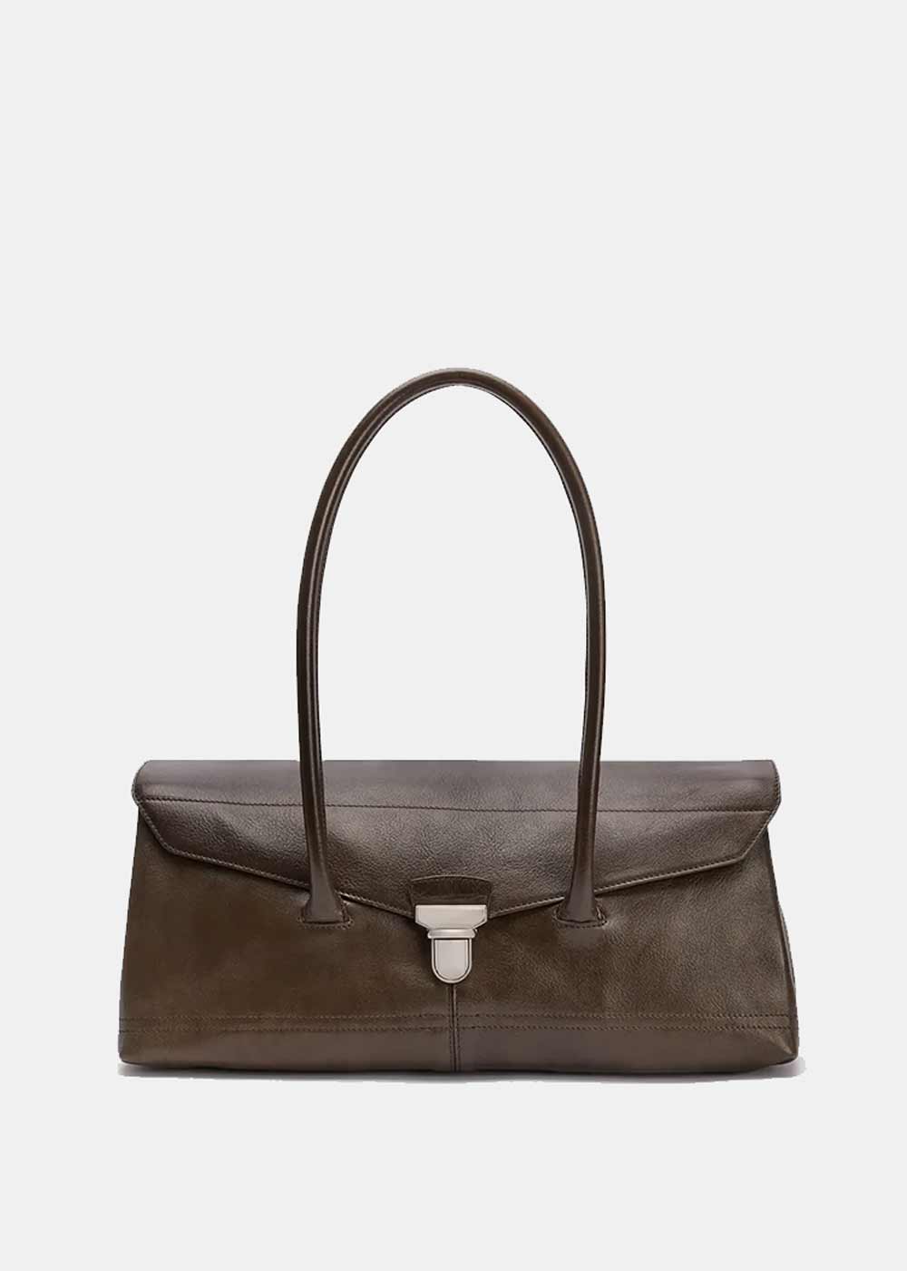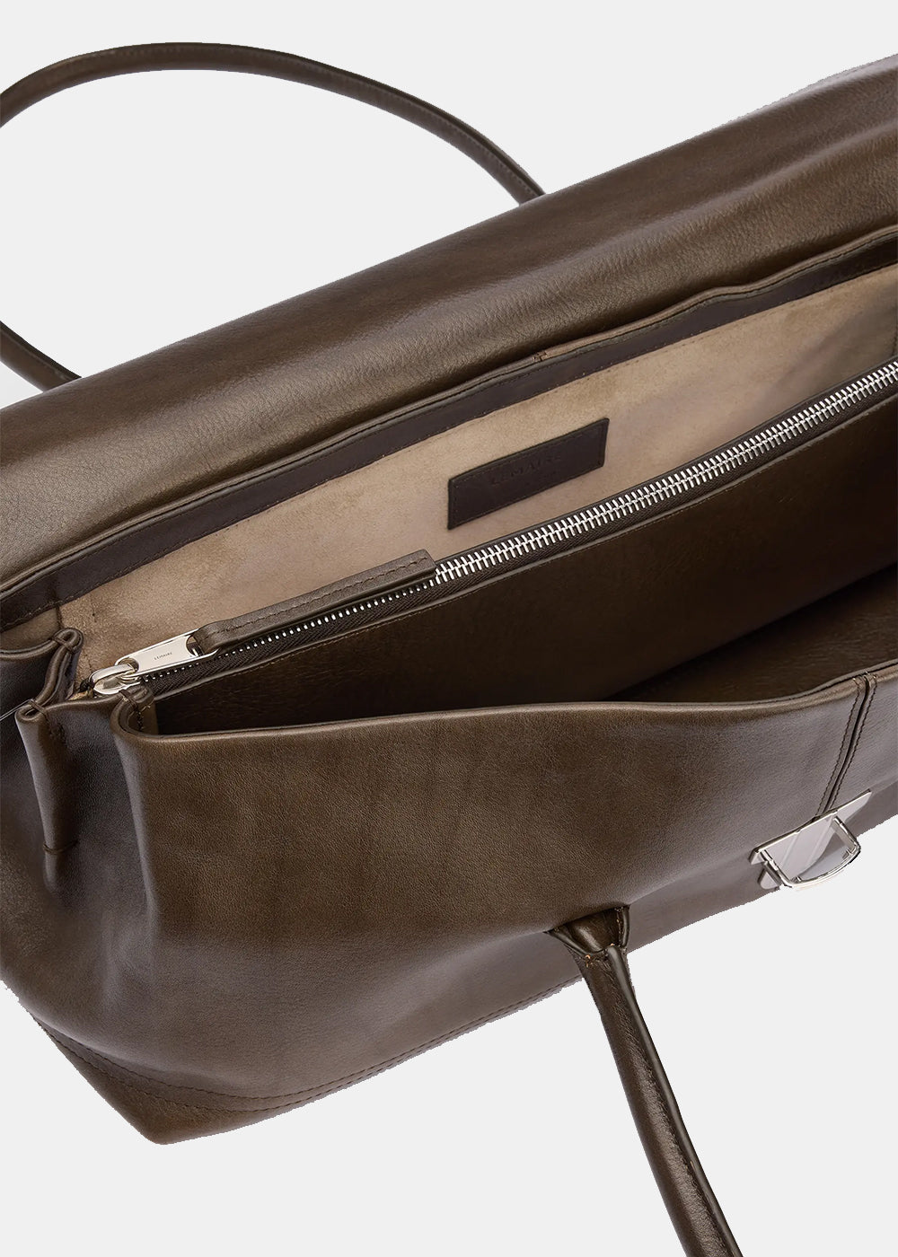 Glossy vegetable leather shoulder gear bag in khaki brown.