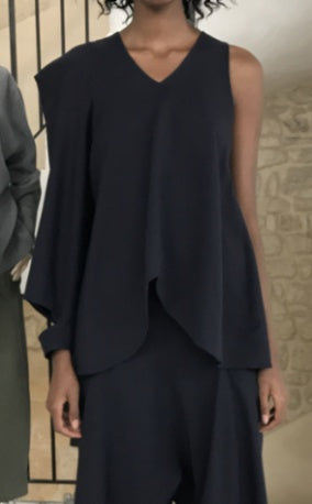 Asymmetric shirt in lightweight wool blend. V neckline. Single sleeve with shoudler gusset. Button cuff at sleeve with cut out detail at wrist. Asymmetric hem.
